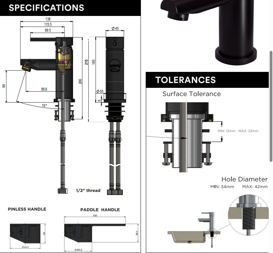 – Depth of mixer is approximately 100mm (from centre of tap to water outlet)